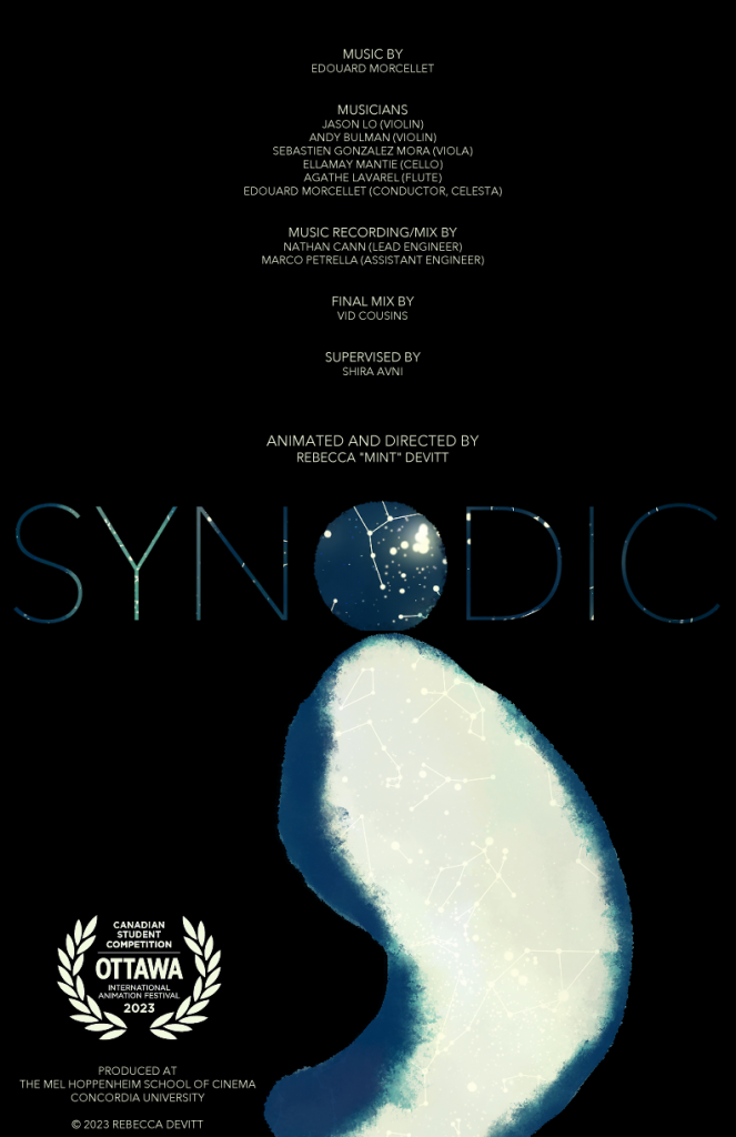 SYNODIC is my directorial debut and final year film created at the Mel Hoppenheim School of Cinema for the completion of its undergraduate animation program. The Ontario, Canadian and International premiere of its full 2 minute long runtime was screened at the 2023 Ottawa International Animation Festival (OIAF) as a nominee in the Canadian Student Competition.
